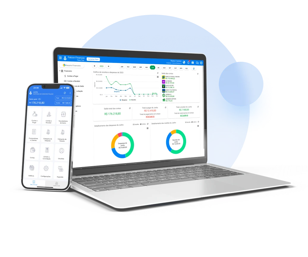 Com o Falcon Finanças, você acompanha e gerencia todas as suas finanças em tempo real, de qualquer dispositivo. Nosso aplicativo de finanças para Android e iPhone permite acesso rápido e seguro às suas contas, onde quer que esteja. Ideal para quem busca praticidade na gestão financeira pessoal ou empresarial.